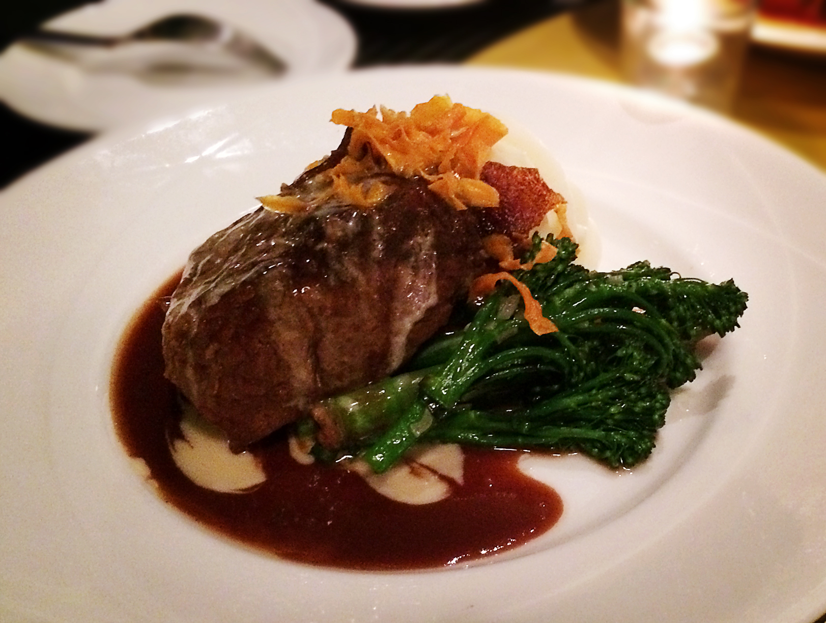 You can cut it with a fork! Braised Short Rib in Peppercorn Sauce. Served with Mashed Potatoes and Vegetables. Perfectly Creamy with Dreamy Risotto. Pan-Fried Halibut in a Lemon-Caper Sauce. Served with Risotto and Vegetables. Yes, the sauce really is that neon red color. Yes, this is as good as it looks. It is Called a Portobello Wellington. Two Portobellos, Wrapped in a Pastry, with Sautéed Spinach and Cheese Inside. Oh, On Top? Just Crispy Swiss Chard.